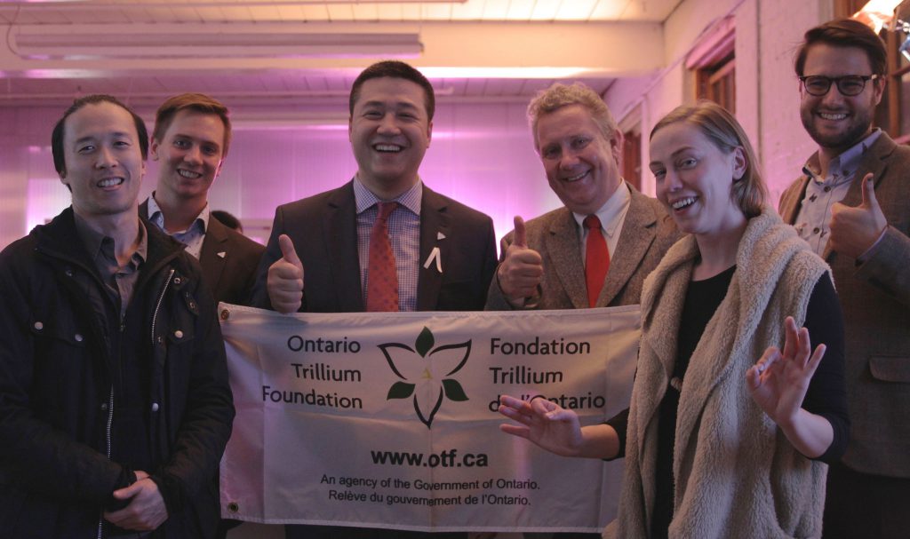 Trinity Square Video celebrates the successful completion of our Ontario Trillium Foundation grant with our local MPP Han Dong (Trinity-Spadina) as we showcased the work of various artists who have benefited from our new editing suites and production equipment. In the main gallery we continued to run the work of Will Kwan, which has been rated a ‘must see’ by Canadian Art magazine, “If All You Have is a Hammer, Then Everything Looks Like a Nail”, a joint production of Trinity Square, Reel Asian Film Festival and Gendai Gallery. A performance of Zeesy Powers’ “TOTAL PANIC” with Andrew Zukerman, Amelia Ehrhardt and Alicia Grant was also presented during the evening.